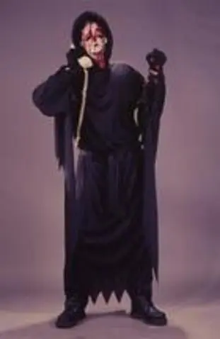 This costume is a “Scream”!!Costume includes: Black robe with long scallop sleeves and bleeding mask with hand pump. Squeeze the hand pump to make “blood” flow down the mask. Liquid is contained inside the mask.Available size: