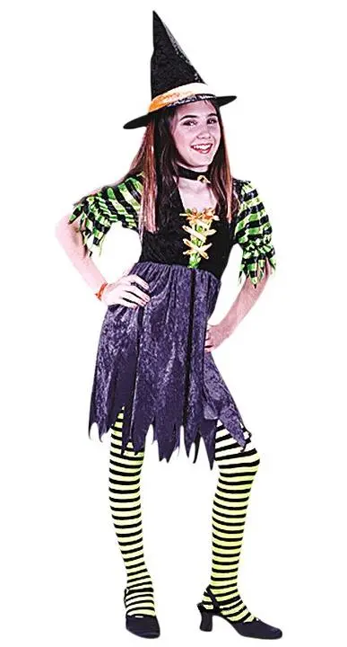 A Fun Look!Costume includes: Velvet Dress with lace-up bodice and zig-zag edging. Witch hat.Available sizes: