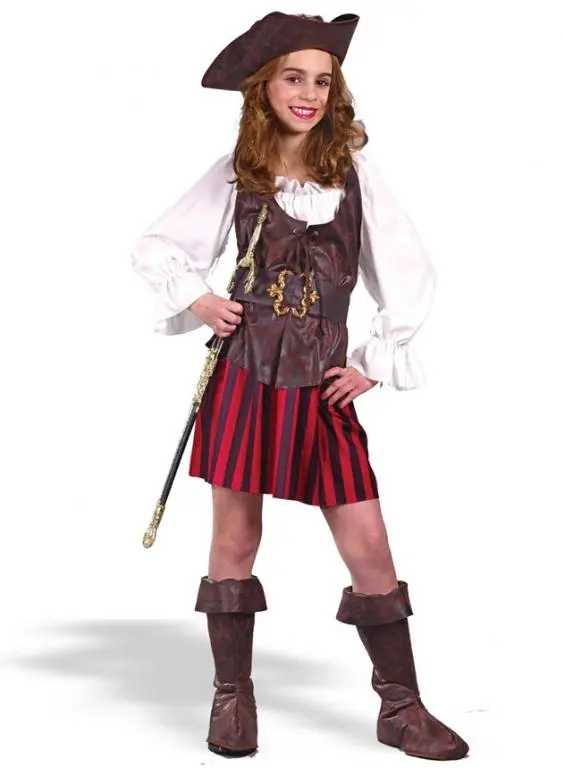 Glamorous Buccaneer Pirate!Costume Includes: A white, red and brown polyester dress with attched vest, hat, belt and boot tops.Available sizes :