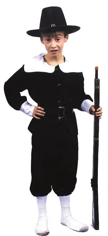Famous Little Pilgrim!Costume includes: Black pants and coat trimmed with white collar and cuffs. Includes black vinyl belt. Available sizes: