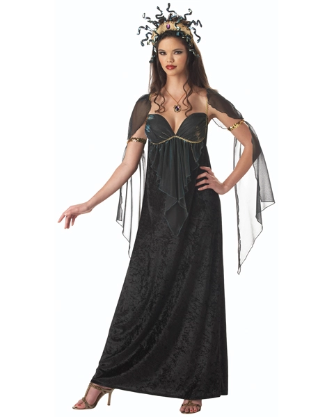 You may not turn anyone into stone, but you are sure to scare the living daylights out of everyone with this one-of-kind Premier Mythical Medusa costume exclusive to Wholesale Costume Club. This outfit features a creepy full length gown with gold accents for maximum scare value. There are accessories galore available with this scary outfit, as you can add a black wig that has the illusion of snakes in it. You can walk in monstrous style with a classy cobra cane, or scare everyone with rings and bracelets that are adorned with creepy crawly snakes. You can channel the ancient world and all its decadence with gold bangle bracelets that add the perfect touch. This is an excellent choice for a ladies outfit for Halloween, a frightening costume ball, as it is sure to send chills down the spine of the weak-hearted. Visit Wholesale Costume Club today and reserve your Medusa costume today.