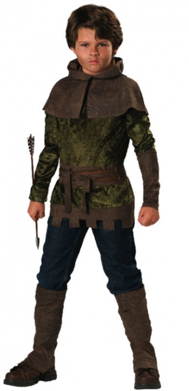 Costume includes: Green velour shirt with brown notched trim, a matching hooded brown cape, brown arm gauntlet, matching belt with multi-tone brown sashes, and boot covers.