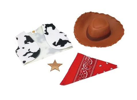 The Woody Accessory kit includes a cowboy hat, sheriff badge, black and white spotted vest* and a red handkerchief.