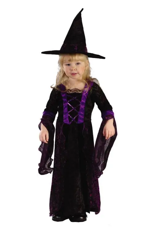 A Precious Little Witch!Costume includes: dress with black lace and purple metalic ribbon and hat.Available size: